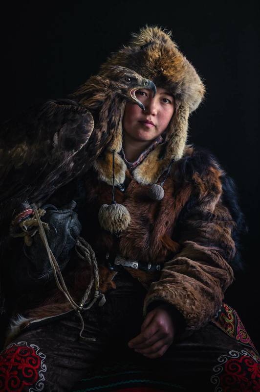 Portrait of Aymoldir Daiynbek, a 14-year old eagle huntress from the remote Altai mountains of Western Mongolia. She follows the footsteps of her father and grandfather, and was crowned the winner of the 2023 Golden Eagle Festival, in which hunters and their golden eagles are tested based on speed, agility, and accuracy.