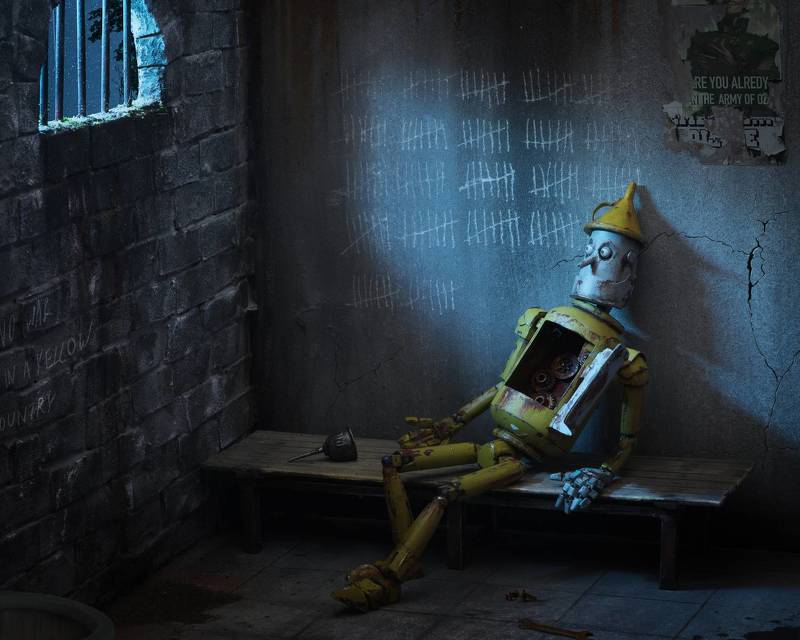 Initially, miniature scenery the walls and floor of the prison, as well as the Tin woodman himself, were made for the work. The creation of the Tin woodman took 2 empty deodorant cans, lego joints and some parts were printed on a 3D printer. In general, the character was made for stop motion animation, the plot of which has a other ending. Shot on Nikon Z6, Sigma 35 Art 1.4. Processing in Photoshop