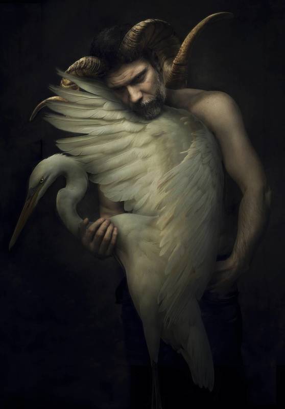 This evocative image captures a moment of enchanted elegance, with a man sporting curly horns cradling a white egret in his arms. The wings of the egret unfold like a delicate fan, symbolizing the ethereal dance between earthly and avian grace, creating a visual ode to the enchantment found in unexpected connections.