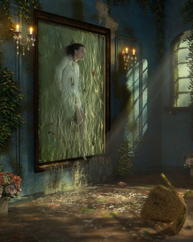 I chose a saturated green for the background to create a sense of the inner world, with its depth and tranquility. This color also hints at nature and growth, reminding us that memories often grow and change unseen. As time passes, memories fade and wear away like the peeling paint on the wall.