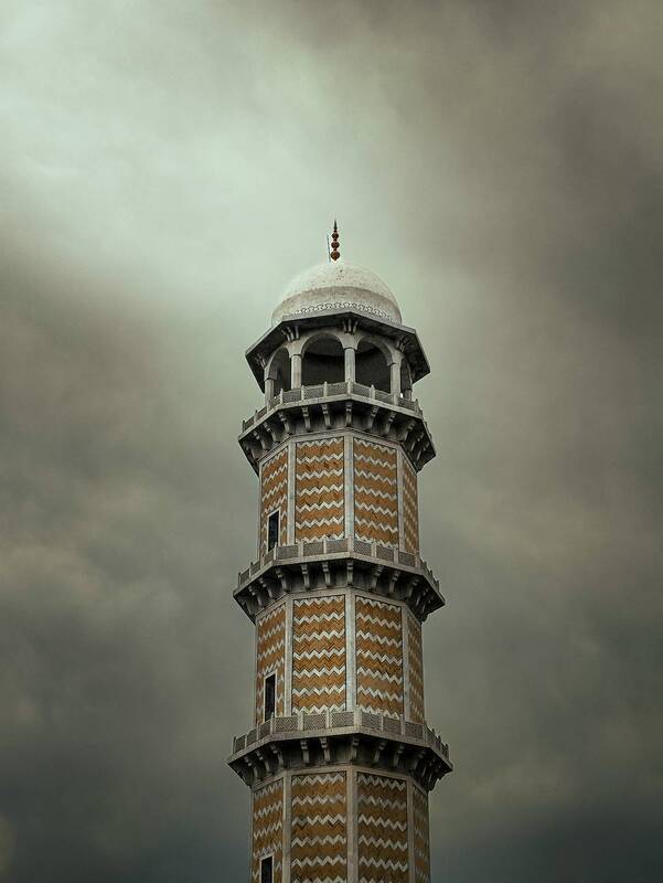 The image depicts a tall, intricately designed minaret against a dramatic, overcast sky. The structure features a distinctive zigzag pattern in yellow and white, with multiple balconies adorned with detailed railing work. The top of the minaret is crowned with a white dome, accented by ornamental finials. The overall atmosphere is moody, enhanced by the dark clouds in the background, creating a striking contrast with the architectural details of the minaret.