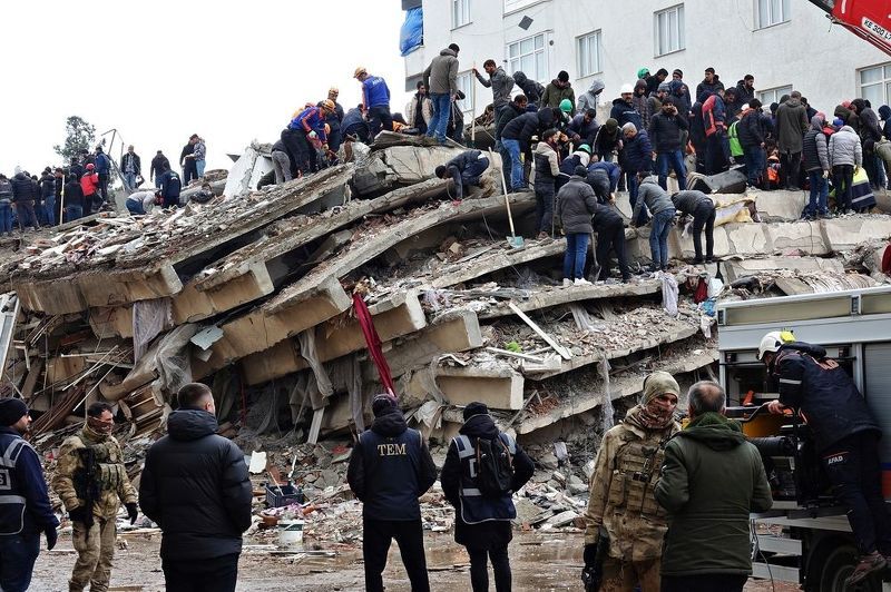 Rescue work is being carried out in the rubble of a building that was completely destroyed in the severe earthquake that occurred on February 6, 2023 in Diyarbakir, Turkey.