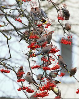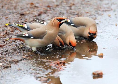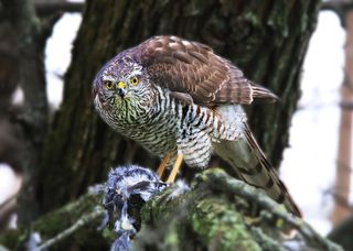 Стая свиристелей налетела на рябину, быстро собирая оставшийся урожай, периодически спускаясь к лужице и запивая талой водой лакомство. И вдруг резко свиристели разлетелись в разные стороны, но один из них оказался в лапах налетевшего ястреба-охотника. Схватив добычу он взлетел на ближайшее дерево и с аппетитом расправился с ней, позволив фотографу подойти и поснимать его за трапезой.