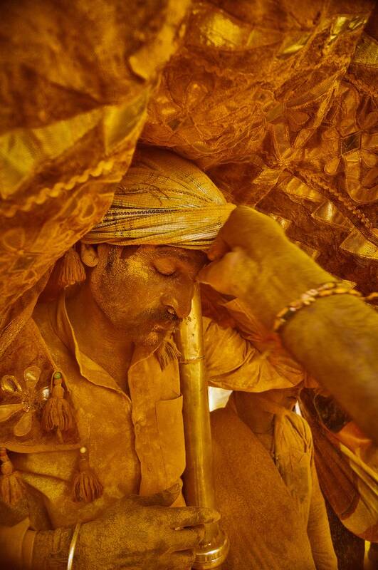 Theyyam is an ancient folk ritual.Kandanar Kelan was out hunting in the forest when suddenly the forest caught fire. Finding no other means of escape he climbed a tree. This tree was also the home of two snakes. The fire consumed the tree, the snakes and Kandanar Kelan. Vayanat Kulavan, another warrior god was passing by the burnt forest when he saw the image of Kandanar Kelan in the ashes. With his bow he traced out Kandanar Kelan and gave him life. The theyyam is an embodiment of the Kandanar Kelan and how he shows his anger towards the fire for burning him up.