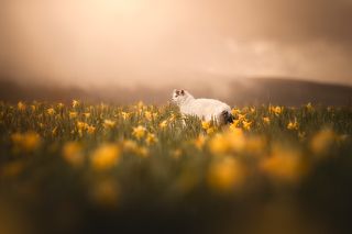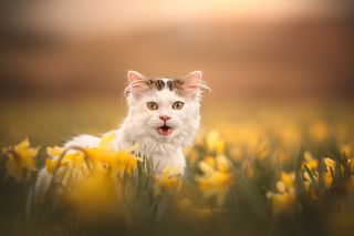 Dans un océan de jonquilles, Solary s'aventure avec curiosité. Son pelage chatoyant contraste avec la mer dorée.