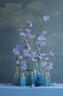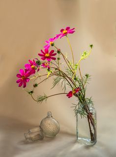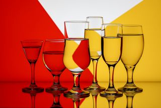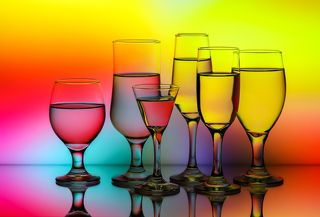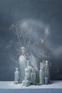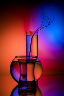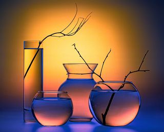 Несколько композиций из стеклянных ваз и стаканов, наполненных водой и установленных веточек сухоцвета, на стеклянной поверхности и разноцветном фоне.