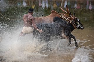 The images are from the traditional Kaalapootu (Bull Surfing ) held mostly in villages in North Kerala. The race takes place during the post-harvest season in August and lasts from noon until dusk. In southern Kerala, these events are held under the name “Maramadi”. Though the events are held in water filled paddy fields after harvest, many of the Panchayaths and private individuals own specially maintained fields exclusively for this event. Kaalapootu is a celebration of the villagers. They gather in large numbers for the event. Kaalapootu, is also a celebration of the strong bonding of human, animal and nature. It is a beautiful symphony created by the fertile mud, water, men and the bulls. In the air charged with excitement and fervor from the “arpuvilikal” ( acclamation ) ,it is the farmers dreams and longing that reverberates in the atmosphere. We witness the natural, spontaneous ushering in of a new season in the ambience of a simple, tranquil village now heady with excitement. The over powering energy and unbeatable enthusiasm of the event, symbolize the indomitable spirit of the villagers.