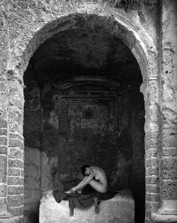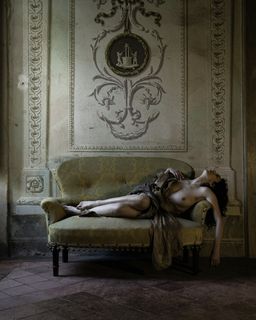 Foto scattata in una villa antica. Tre scatti da posizioni diverse che vogliono descrivere lo stesso sentimento di riflessione e nostalgia della donna per una mancanza di amore accentuata dalla presenza di un mezzobusto di uomo di marmo che la guarda mentre lei triste le volta le spalle guardando fuori dalla finestra.