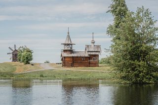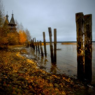 Деревянный храм на берегу озера. Карелия.