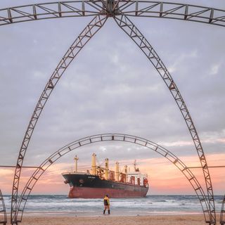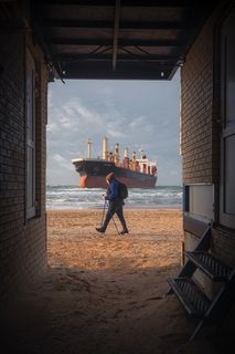 Shrimp boat broke down at sea and washed up on Port Aransas Beach. The boat's name is Second Chance. It has been a real struggle for them to break free of the beach and return to the sea.
