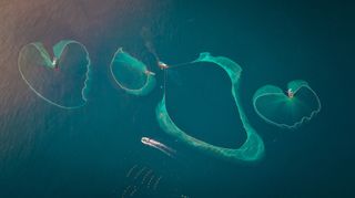 Around July every year, fishermen on the coast of Hon Yen, Tuy An district, Phu Yen province go out to sea to "finish nets" to exploit anchovies, creating beautiful moments. Fishermen cast their fishing nets out to the sea, creating different shapes in the water, including the shapes of a circle, a heart, or a lotus leaf. As ussually, from May to August, local fishermen in Nhon Hoi hamlet flock to Hon Yen Islet to catch anchovy. Bustling scenes in harvesting season have become attractive to photo hunters.