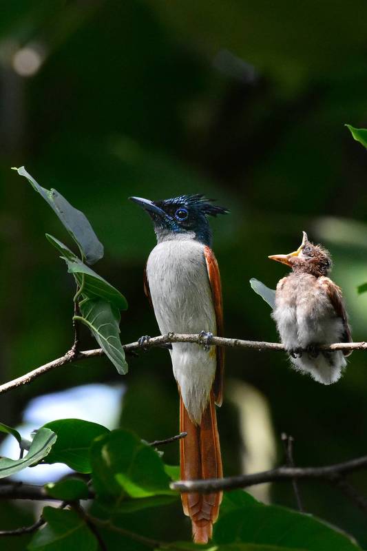 A devoted father, the male Paradise Flycatcher, adorned with striking plumage transitioning from rufous to white, demonstrates his attentive care for his chicks. The captivating beauty of the scene lies in the way the chicks eagerly stretch their necks towards him for nourishment, resembling a blossoming flower in nature's embrace.