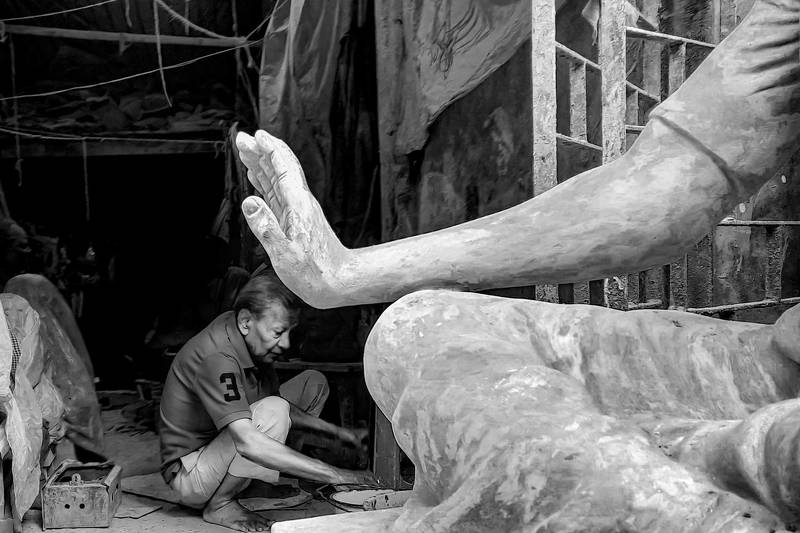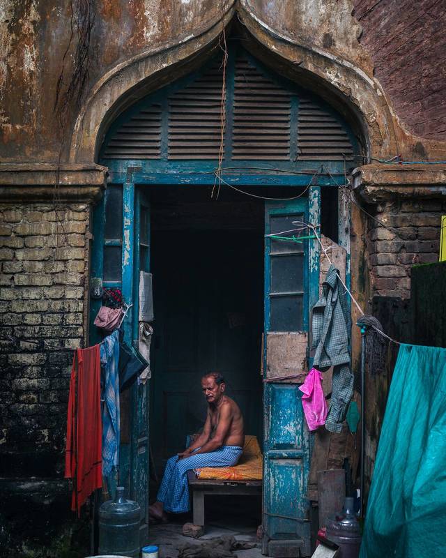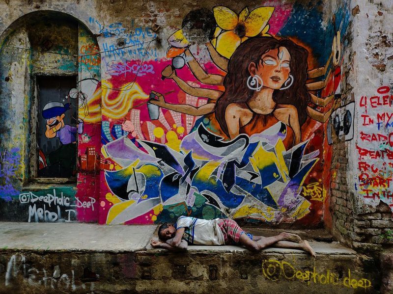 In this captivating photograph captured in Kumartuli, Kolkata, a profound narrative unfolds. Amidst the ancient alley, where skilled artisans sculpt Hindu deity idols all year long, especially before the revered Durga Pujo, an arresting scene takes center stage. In the frame, an artisan, his hands and legs caked with mud from his craft, rests soundly on the weathered porch of an old building. The juxtaposition is striking, for on the very wall behind him, a vibrant graffiti of Maa Durga adorns the surface. This poignant image beautifully encapsulates the idea that, in the nurturing embrace of Goddess Durga, the universal mother, everyone in the world finds solace and comfort, just like the man in the photo, sleeping soundly in her divine arms amidst his labor.