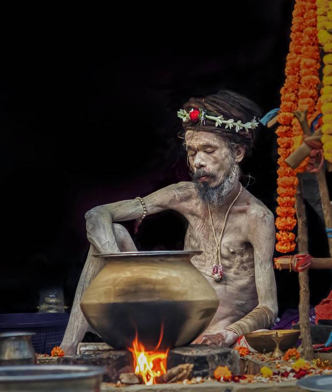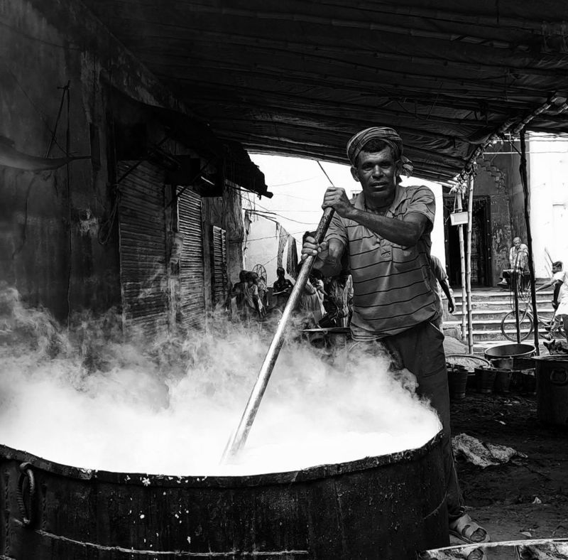 Preparation of Mahavog This is a special Ceremony called \"Mochhob\" in Kandi murshidabad District of West Bengal, India , where thousands of devotees take this prasad on the occasion of Ratha Yatra Festival (Ulta Rath). This retual is going on for many decades. People from different places take part in this occasion. The man in this photo is on of the devotees ,who is helping in cooking the Mahaprasad .