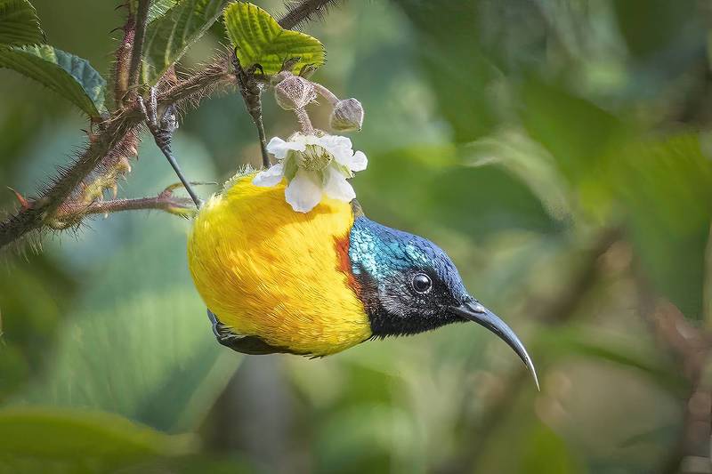 The purple sunbird is a small bird in the sunbird family found mainly in South and Southeast Asia but extending west into parts of the Arabian peninsula. Like other sunbirds they feed mainly on nectar, although they will also take insects, especially when feeding young. They have a fast and direct flight and can take nectar by hovering like a hummingbird but often perch at the base of flowers. The males can appear all black in harsh sunlight but the purple iridescence is visible on closer observation or under good light conditions. Females are olive above and yellowish below.