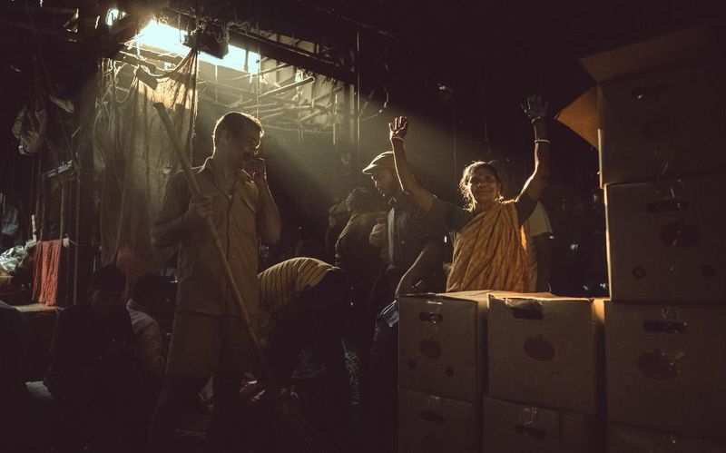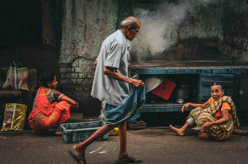 This is a street shot taken in one of the most busiest markets of Kolkata on one fine winter morning. There the god rays are falling on the women and the sweeper, the two main characters in action. The woman is praying to god with her hands in air so that she can make a good sale for the day while the sweeper laughs at her actions.