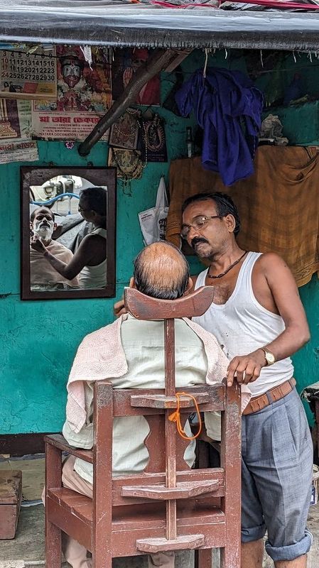 Kolkata, popularly known as the city of joy, has amongst its vibrant culture the street barbers. Their numbers have drastically declined because of other luxurious and expensive options throughout the city. These barbers cover their roof of operating space with plastic sheets to cover from the sun/ rain. Many are often seen sitting on a small stool on the roads itself. This category of barbers aren't static. They roam around various places carrying a small toolkit bag searching for clients. Kolkata has options for every section of the society — be it rich or poor!