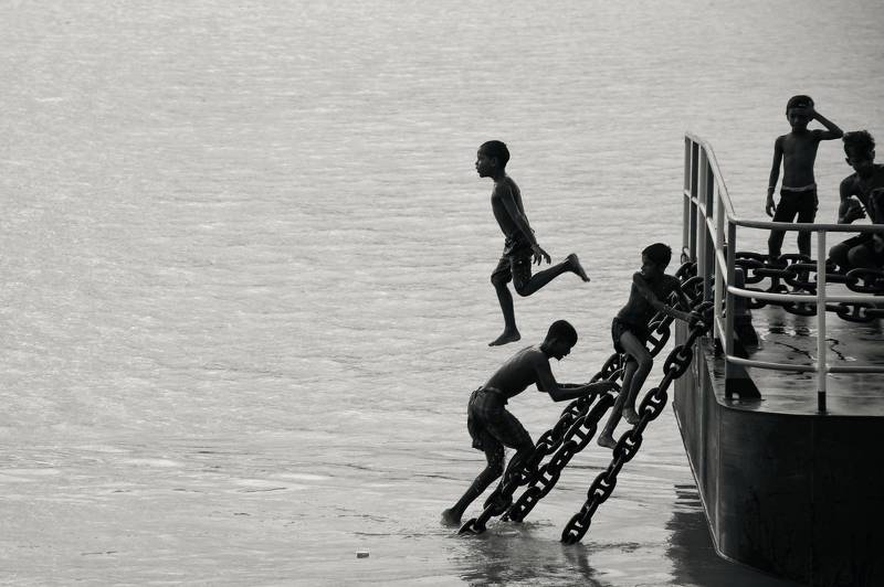 Dive Out - The ghats of Varanasi are usually full of activity. But during one of my photowalks I was able to isolate this moment where I captured this man leaping into the water, while his clothing was left out to dry. I was waiting for a moment this unique and wasted no time freezing it through my camera.