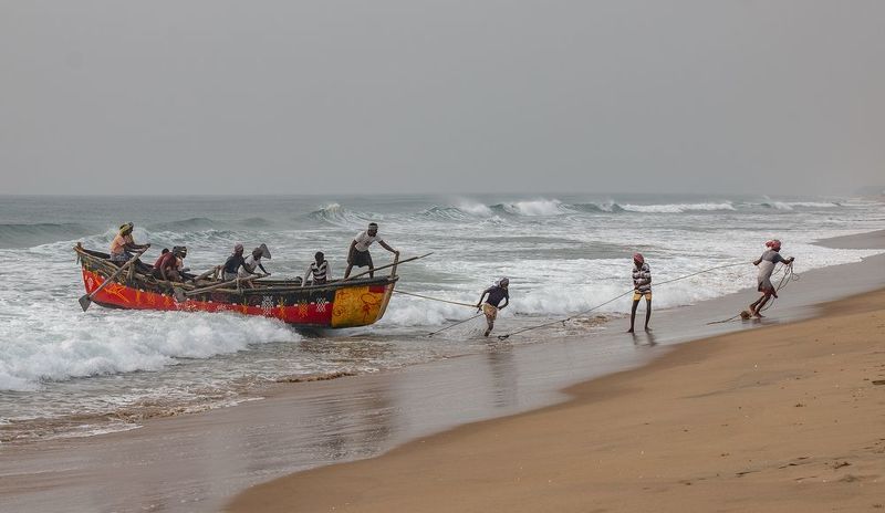 I was walking through the Puri sea beach in India early morning with camera.This was crowded place.Many tourist,fishing community workers, cats-dogs-crows-boats and others sellers all the activities were around that place.A fisherman collect the fish from the net, two boy was passing through and they gave look towards the fish and a crow was flying for own food. Its look like to me that everyone needs food so observed the situation.