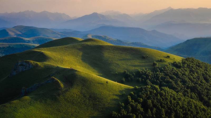 Мостовской район Краснодарского края, Псебайский заказник, вид с вершины г. Асбестная на массив Чёртовы ворота, образующийся горами Западный Ачешбок (2486м) и Восточный Ачешбок (2440м).