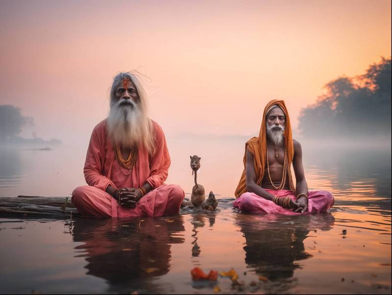 Two Sadhus, Hindu ascetics, are found meditating by the banks of the Ganges River, near Varanasi. In the calm embrace of dawn, with the sky painted in hues of orange and pink, they sit in serene contemplation. The surrounding mist adds a mystical veil to the scene, enhancing the spiritual aura of their practice. Dressed in vibrant shades of pink and orange, they embody spiritual renunciation, a vivid contrast to the subtle whispers of nature around them. Flowers and a small idol float nearby, elements of their devotional offerings. This image captures a moment of profound peace and devotion, a testament to the enduring cultural practices by the sacred waters