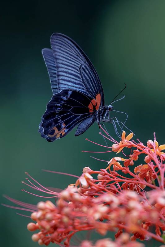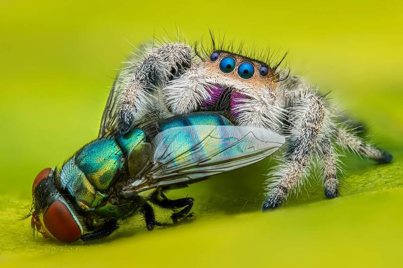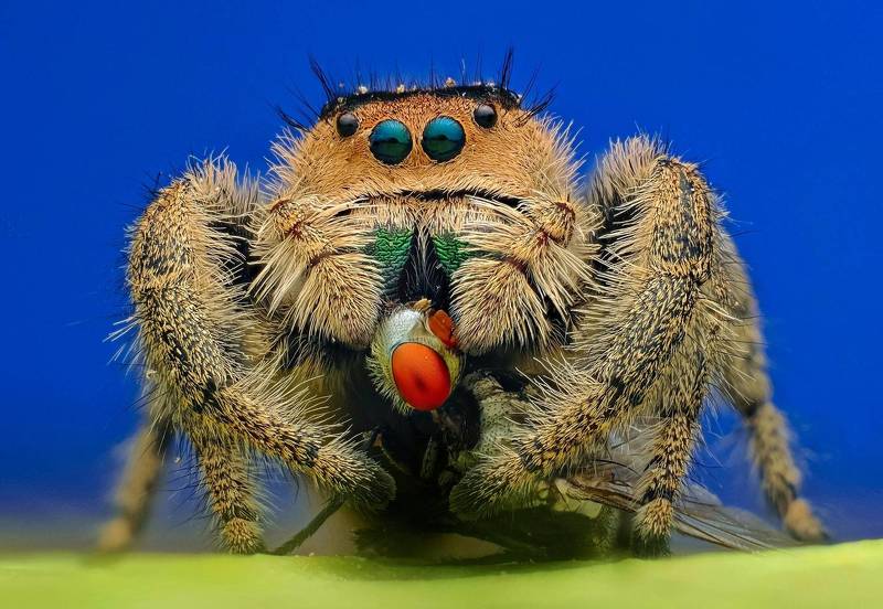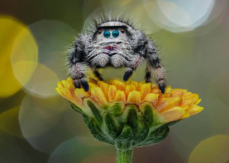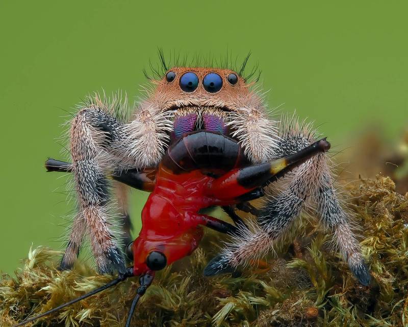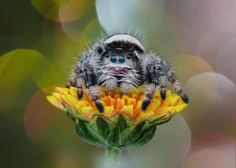 At springtime, we have many poppy flowers in our garden. This is also the time, when the jumping spiders are getting more active. I wanted to create a photo that reflects the warm colors of the poppy with the little resident of my garden. I am aware, that jumping spiders often jump around during photo shoots. But I was never able to catch the very last moment before the jump. So I was more than happy, when I reviewed the photos of this shooting, and realized, that I actually managed to freeze this moment with the photo. Also I was instantly smiling, as he looks like he is conducting some classical music.