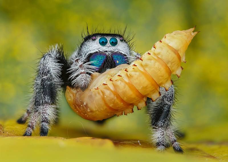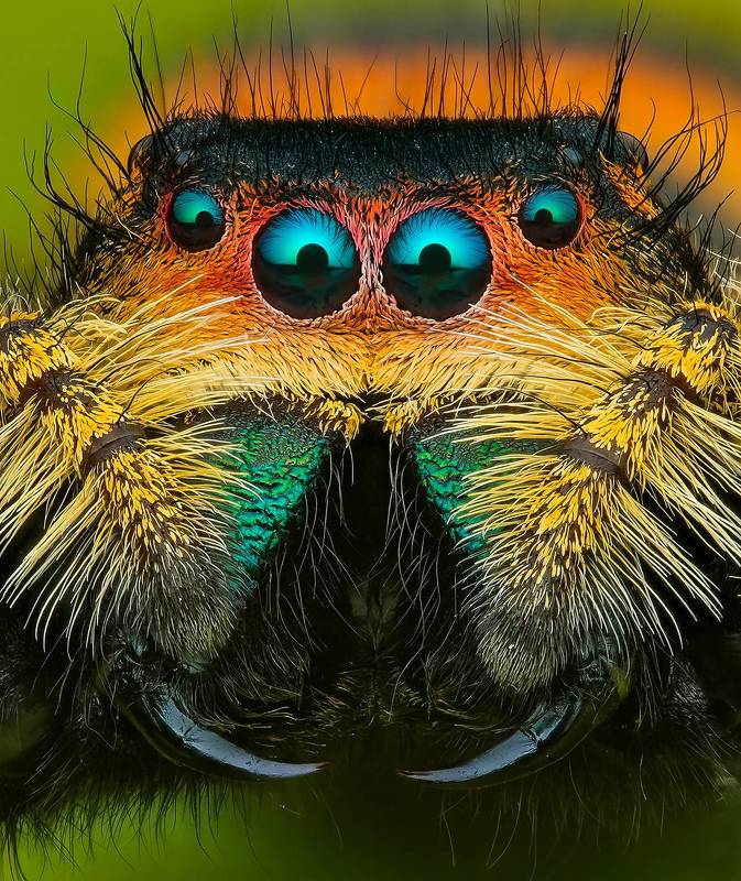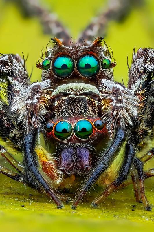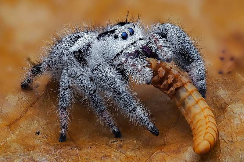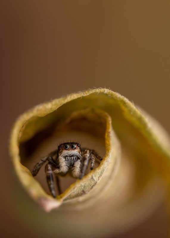 The idea was to frame this little jumping spider with the rolled autumn leaf. Fortunately jumping spiders love to explore and hide, so she went in the leaf roll right away. I just had to be patient and wait till she came to the opening, then took the shot. I found this spider in my garden, crawling on the soil, and as many autumn leaves were lying around, I thought it would be fun to portrait her with the autumn leaves. She was very comfortable when I placed her on the leaf, and began to explore it. She was also curious about my equipment, so we could shoot for quite a while. I really love to use autumn leaves as background, they have lovely color, and they are comfortable for spiders to crawl around.