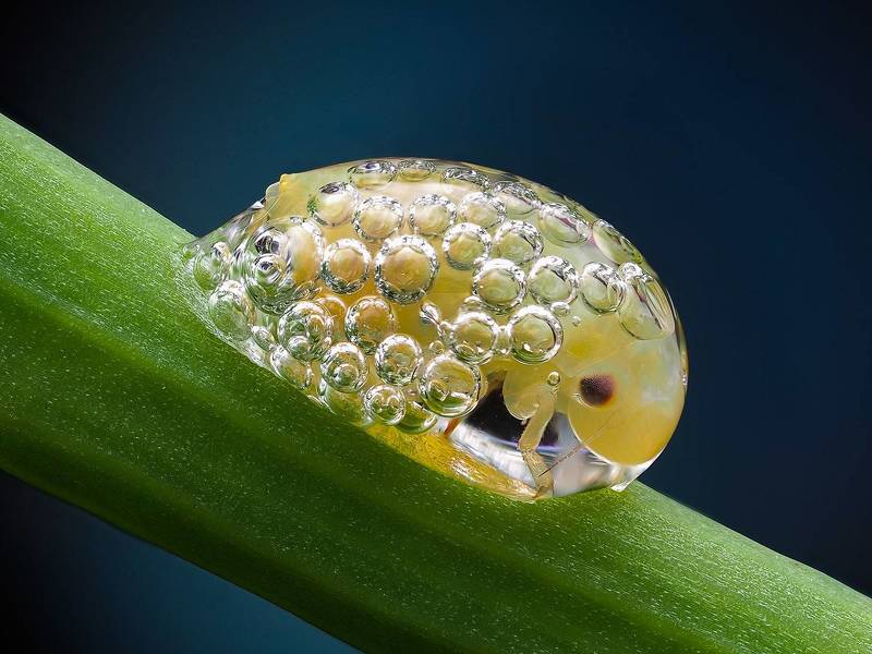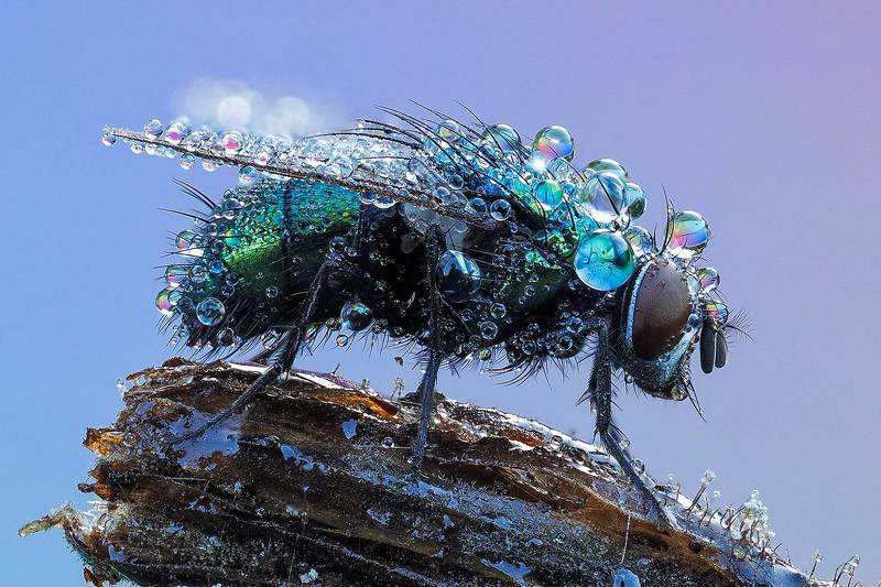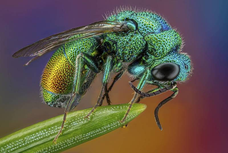 It is a small colorful fly called Chrysididae. Fabulously colored, parasitic hymenopterans with a metallic shiny, sparsely haired body. Very hard chitin armor, protecting against stings. It is a stack of 213 photos arranged into one whole