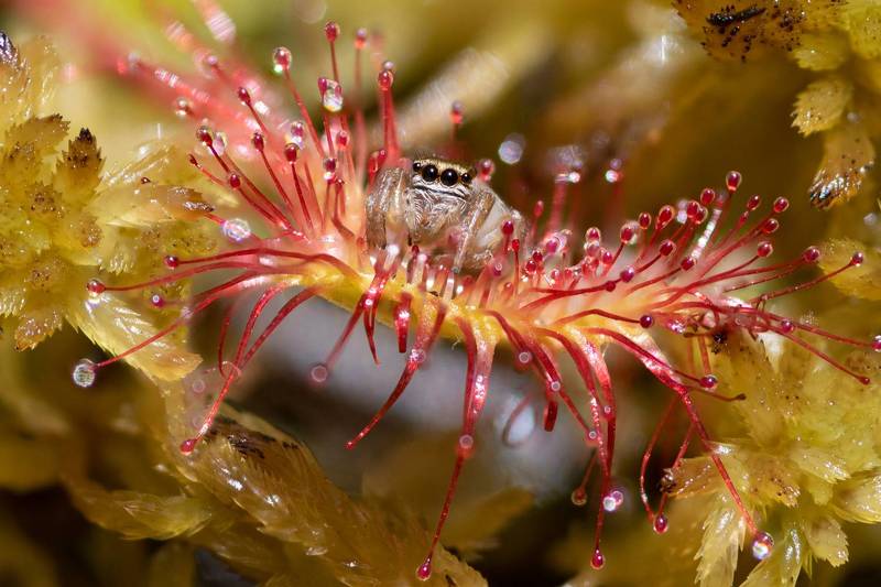 Паук скакунчик оказался в плену росянки круглолистной