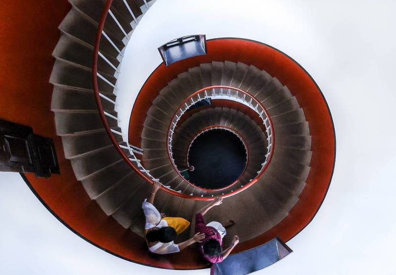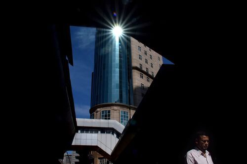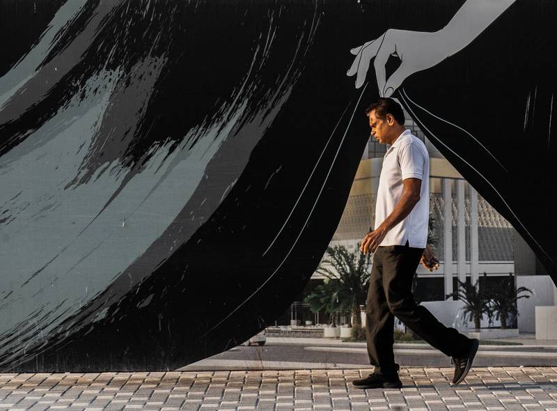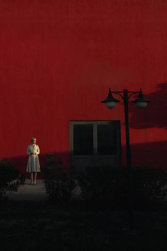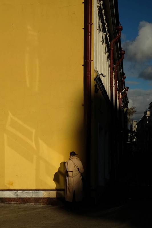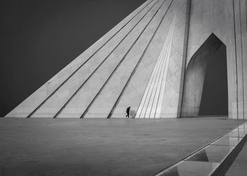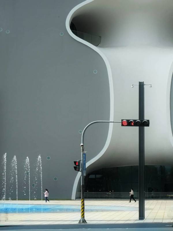 The curve of the building facade separates the light and dark blocks of the building.The overall geometric structure and color tone present a modern minimalist cityscape and street photography style.The insignificance of pedestrians shows the grandeur of the building.