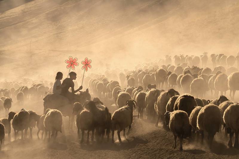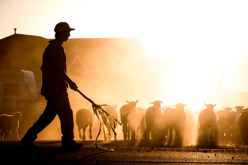 A migrant ranch hand helps guide his flock of sheep towards their destination.