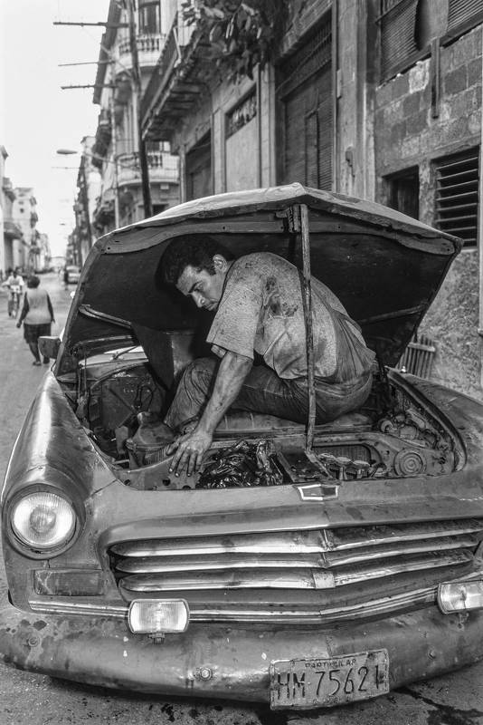 The surprising position of the mechanic over the engine of an old Chevrolet and the expression on his face denote two emotions: the weight of destiny but also the will to face it. Havana, Cuba.