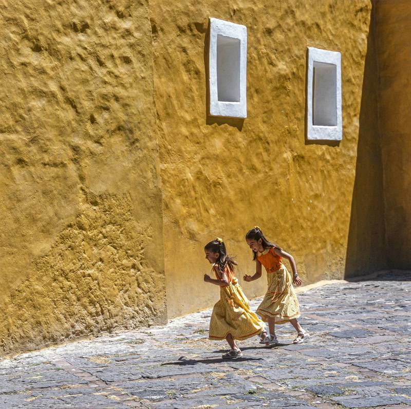 Two little sisters run happily after mass in the atrium of a church in Coyoacán, Mexico City