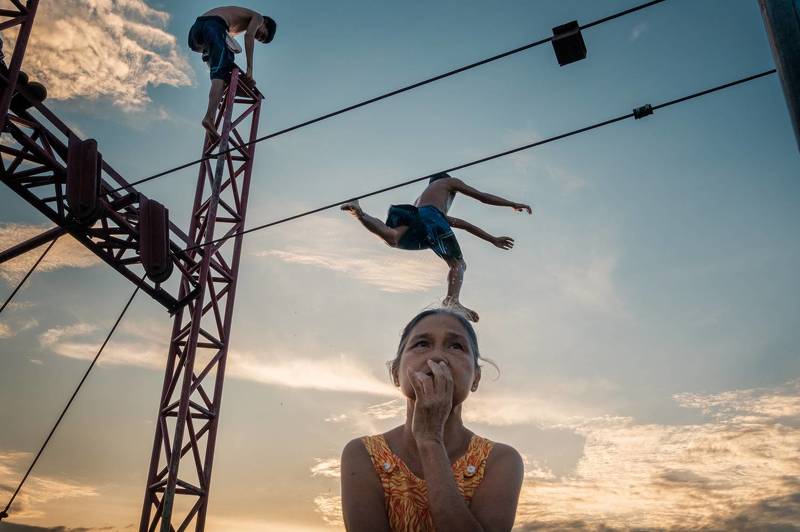 A split-second of thrill and tension: a boy leaps midair above a woman\'s anxious gaze, frozen at the perfect, decisive moment.