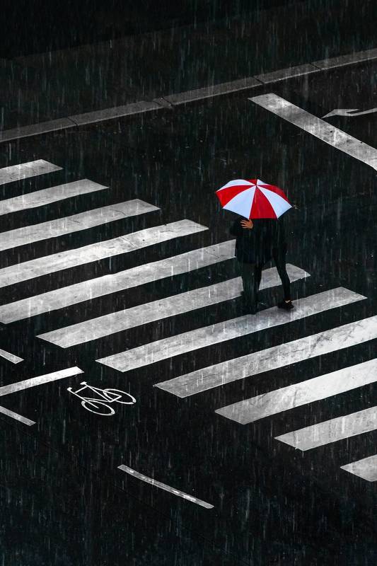 In this captivating photograph, a compelling top-down view is presented of a pedestrian pathway stretching through a cozy landscape in rainy weather. Two individuals, engrossed in conversation or perhaps in tranquil self-reflection, stroll beneath a sturdy umbrella, creating a warm and intimate scene in shades of gray. The glisten of wet asphalt and the reflections of light points on the surface evoke an atmosphere of mystery and romance, making this moment truly unique. In rainy weather, ordinary moments transform into magical ones, and this photograph captures that enchanting moment when umbrellas and rain foster coziness and unity in the gray ambiance.